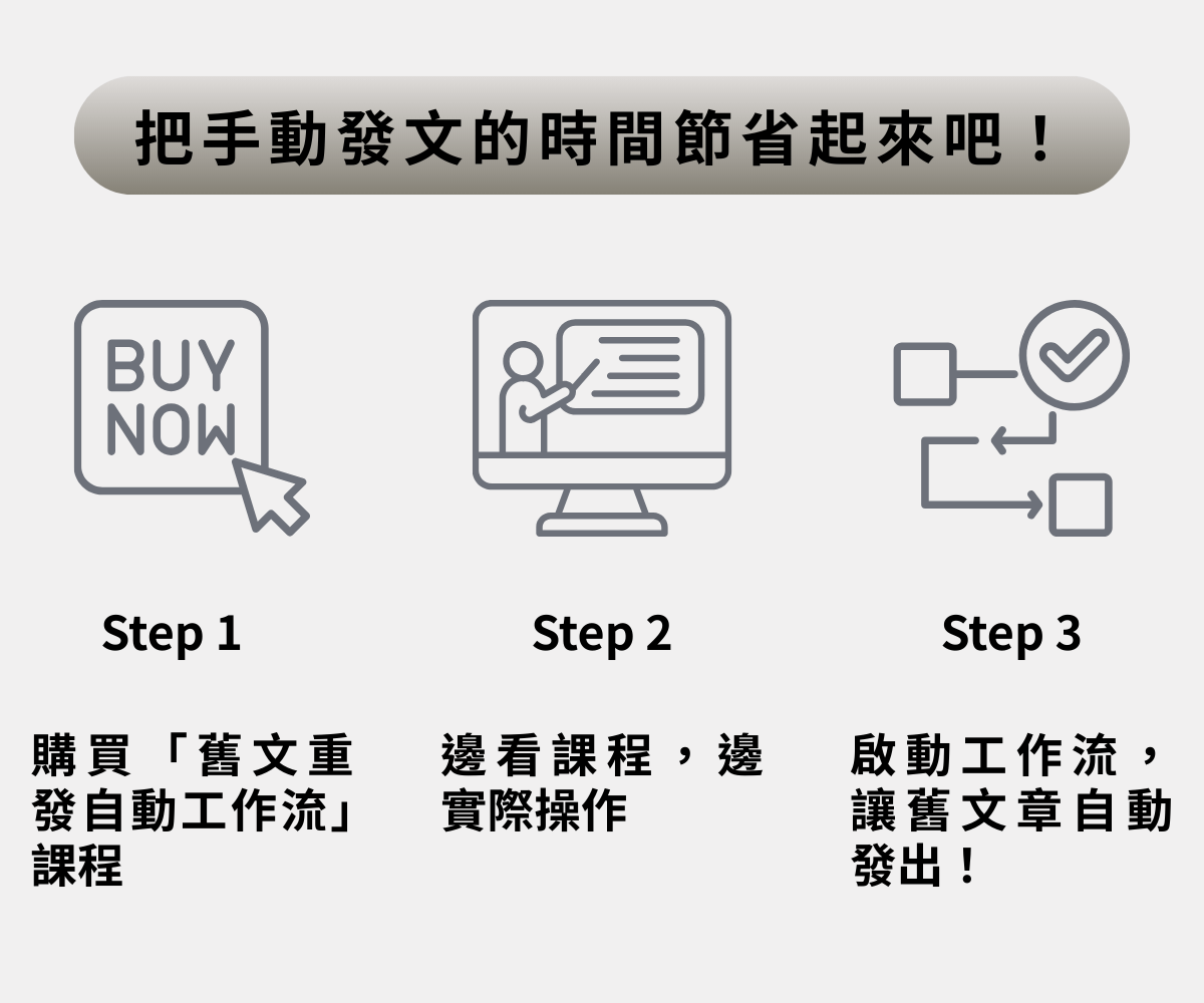 購買後可與我約時間和地點,我將親自到府為您設定舊文重發自動工作流;購買後您也會擁有線上課程影片
