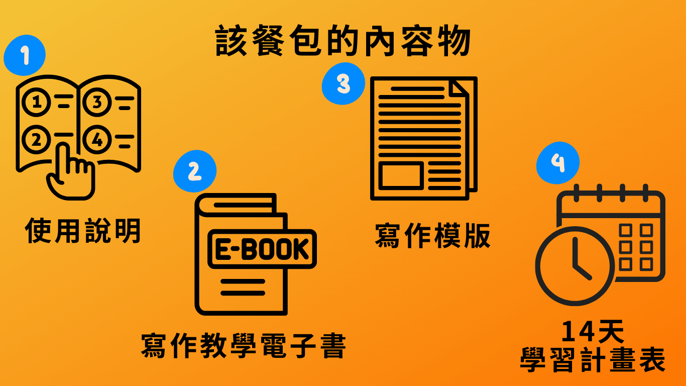 雖然我不斷強調「寫書評」是寫作中最簡單的形式,但它也不是簡單到能夠無腦輸出,你還是需要花點腦力思考,思考怎麼把作者的思想有邏輯地表達出來、思考怎麼樣的寫法才能讓讀者容易吸收。如果你不擅長以上的思考,且想要學習寫書評的話,我推薦你學習我的《書評(閱讀心得)寫作模板餐包》。這份餐包的內容物有四個:使用說明書、書評寫作模板、22 頁的書評寫作教學電子書、14 天學習計畫表。這份餐包可以讓你以最直接、最便宜的方式學會寫書評。說它便宜是因為只要一顆便當的價格,這也是為什麼我稱它為「餐包」。
